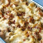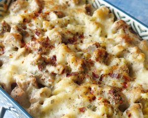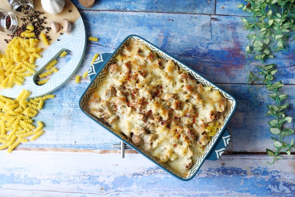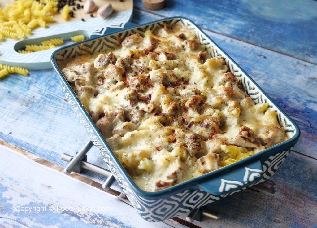Baking dish ko oil sa grease karein,boiled spiral pasta,alfredo sauce aur chicken cubes dal ker mix ker slightly stir ker lein.