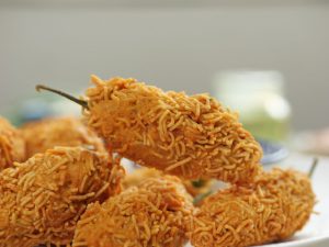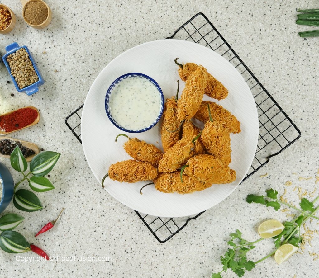 -Stuff green chillies with prepared pickle mixture then dip in prepared pakora batter & coat with nimco sev.