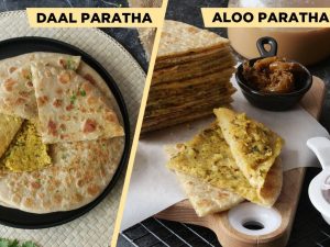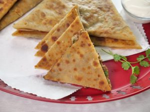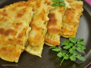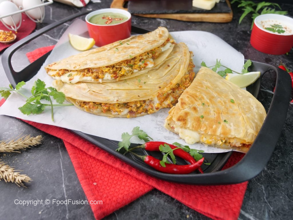 -On one side of paratha,add mozzarella cheese,prepared filling,cheddar cheese & flip the other side of paratha over it & cook from both sides with desi ghee until cheese melts (makes 4) & serve!