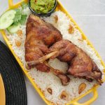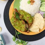 -Fried chicken piece ko meat mallet ki madad sa pound karein aur tayyar spicy sambal laga lein.