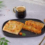 -Add 2 tbs of whisked eggs,onion,fresh coriander,green chilli,cheddar cheese slice & fold all sides of dough,apply whisked eggs & seal properly.