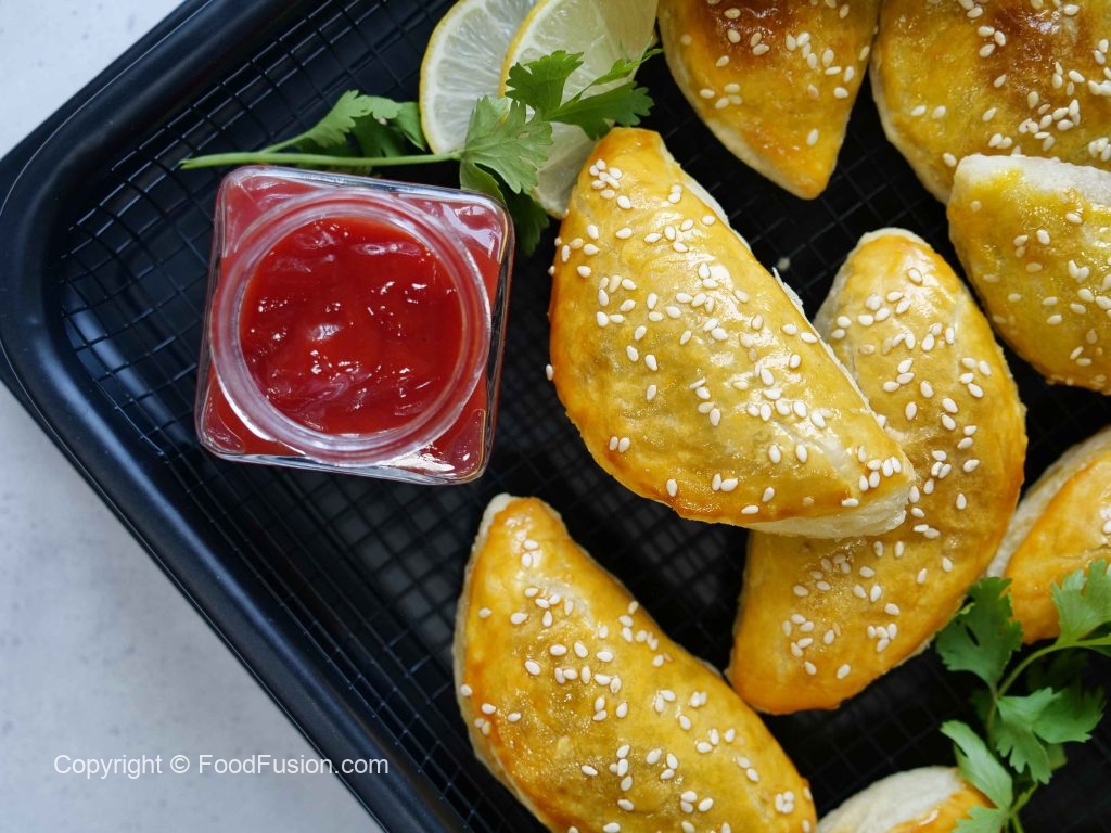 -Edges per pani laga lein aur tayyar filling (1 tbs) dal ker D shape mein fold ker ka properly seal ker lein.