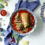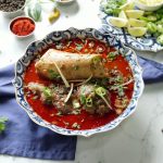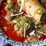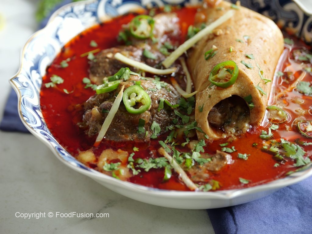 -Pour reserved oil (tarri) on nihari,garnish with green chillies,fresh coriander,ginger & serve with naan!