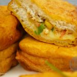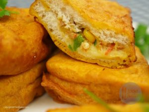 Stuffed bread slices ko triangular shape mein cut ker lein.