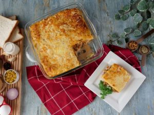 In a baking dish,add & spread prepared white sauce,bread slices,prepared vegetable sauce,white sauce, cheddar cheese,mozzarella cheese,bread slices,red sauce,white sauce,cheddar cheese,mozzarella cheese,bread slices,pour prepared egg mixture,cheddar cheese & mozzarella cheese.