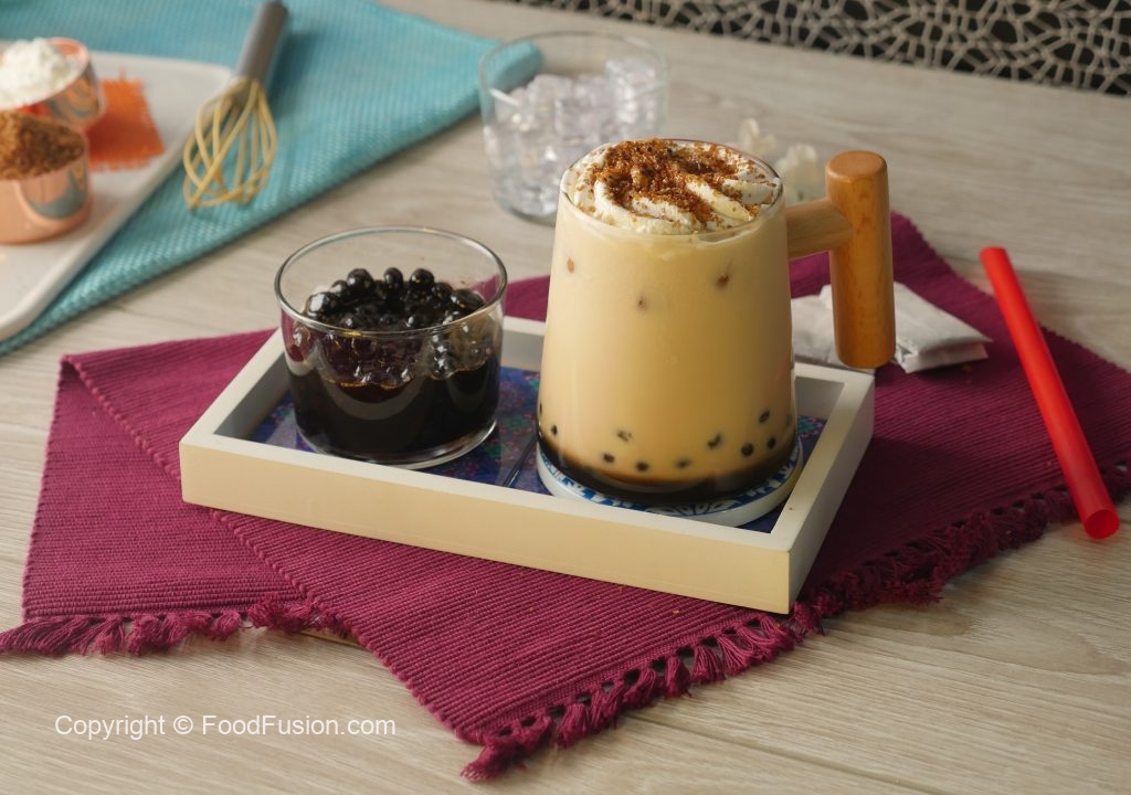 In a serving or mason jar,add ice cubes,prepared boba pearls with syrup,prepared black tea,prepared milk syrup and top it with whipped cream,sprinkle brown sugar and burnt with blow torch & serve!