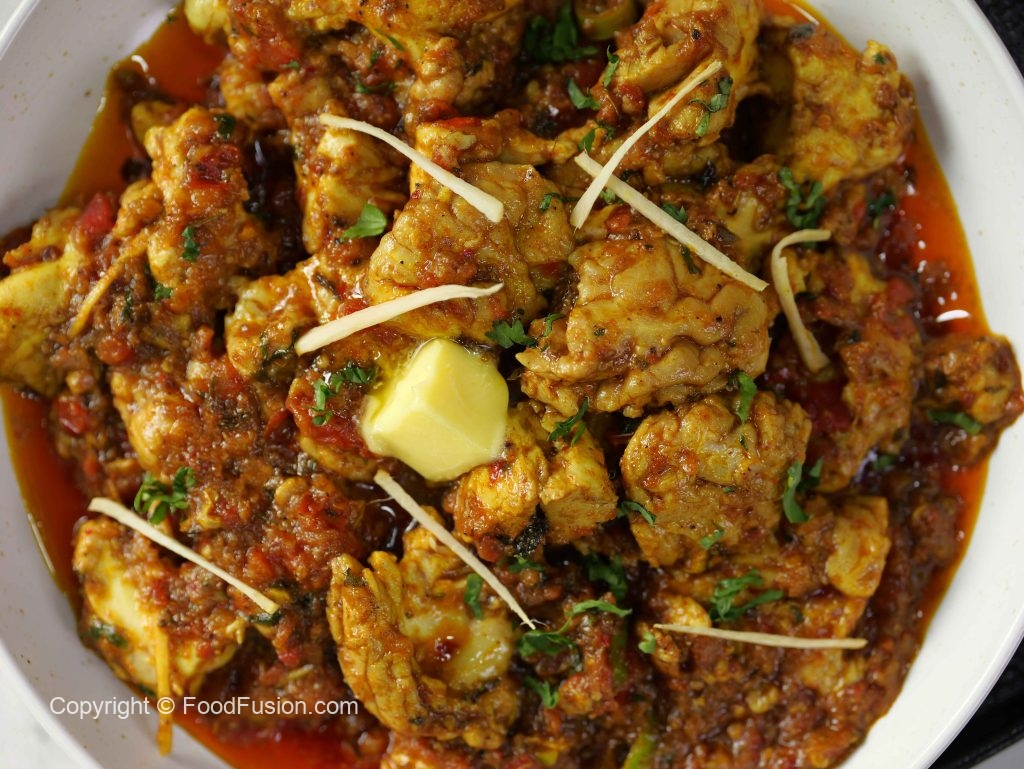-Ek bowl mein pani,ice cubes aur bakray ka maghaz dal ker 5-6 minutes kliya chor dein phir devein ker ka outer thin membrane ko remove ker lein aur pieces mein cut ker lein.