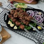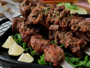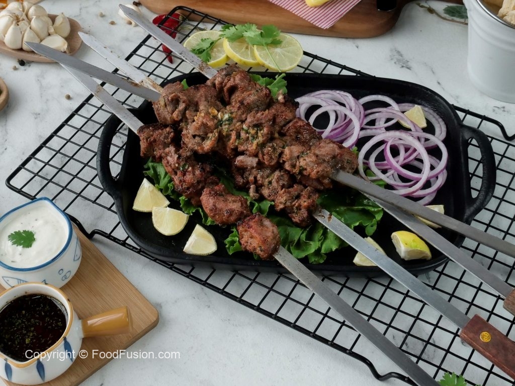 Marinated mutton ko metal skewers per laga lein aur jaltay hoye koyla per paka lein aur bech bech mein tayyar herbed makhan lagatay rahien.