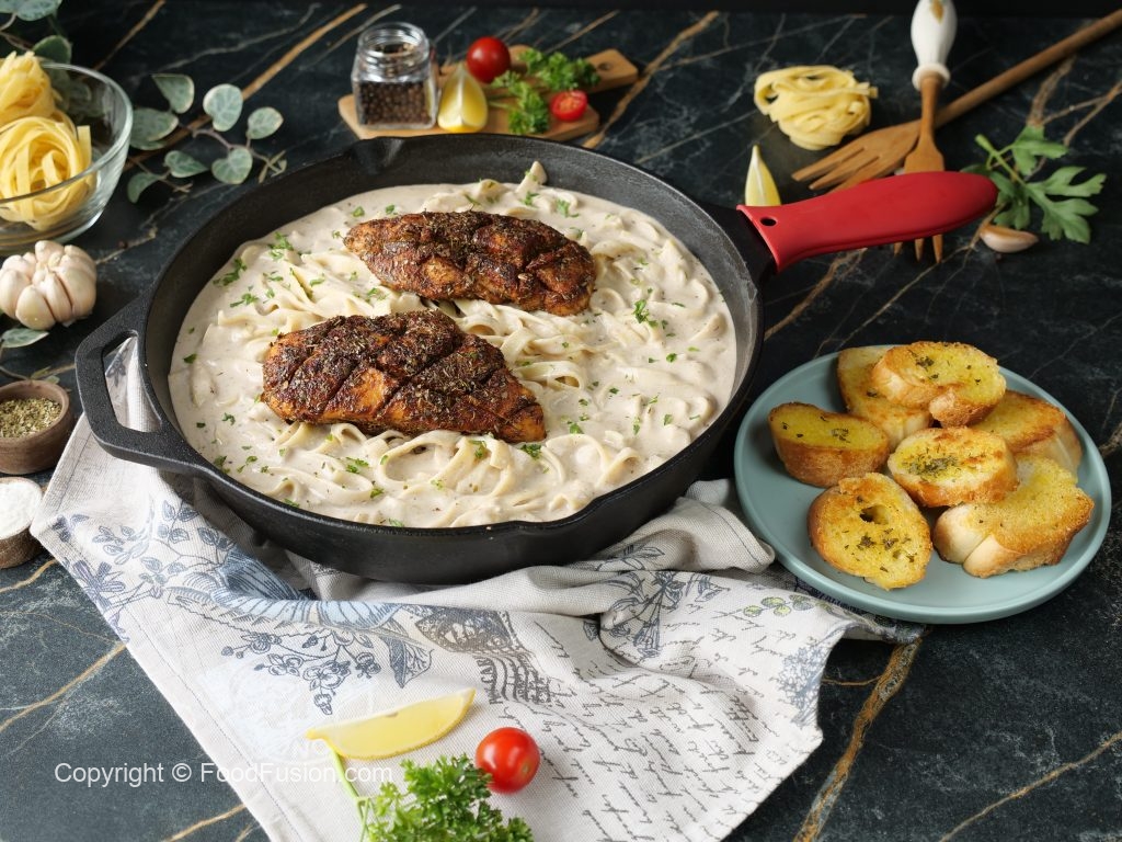 -Cast iron pan mein cooking oil dal dein aur chicken fillets ko halki ancch per dono sides sa paka lein (5-6 minutes each side) & side per rakh dein.