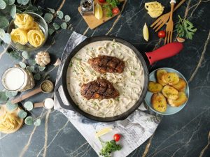 -In a cast iron pan,add cooking oil,place chicken fillets & cook on low flame from both sides until done (5-6 minutes each side) & set aside.