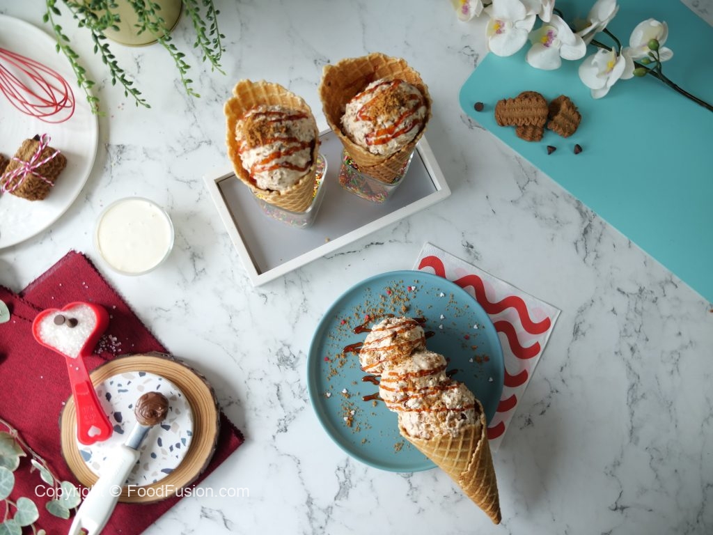 -Once frozen completely,scoop out,drizzle caramel syrup,add crumbled candi biscuits & serve!