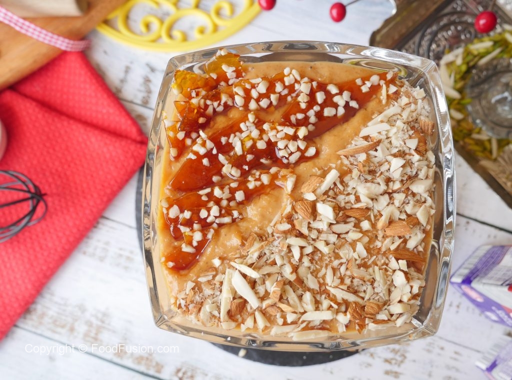 Serving dish mein caramel firni dal dein,badam aur caramel crunch sa garnish ker ke serve karein!