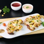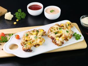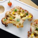 -On cauliflower disc,add & spread pizza sauce,add pizza cheese,capsicum,corn kernels,pickled jalapenos & air fry at 180C until cheese melts (3-4 minutes).