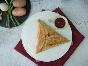Place rolled dough and prick with skewer,fold and seal the edges (makes 3).