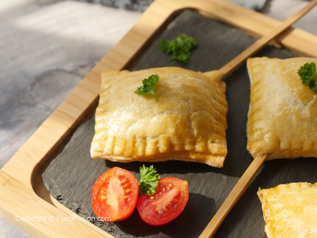 At one corner of the piece,place skewer,add prepared chicken filling (1 tbs) and cover with another piece,press and seal the edges with the help of the knife (makes 20).