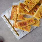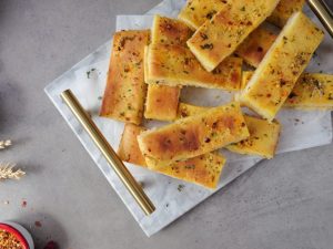 -Tayyar garlic butter laga ker sticks mein cut ker lein.