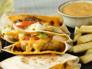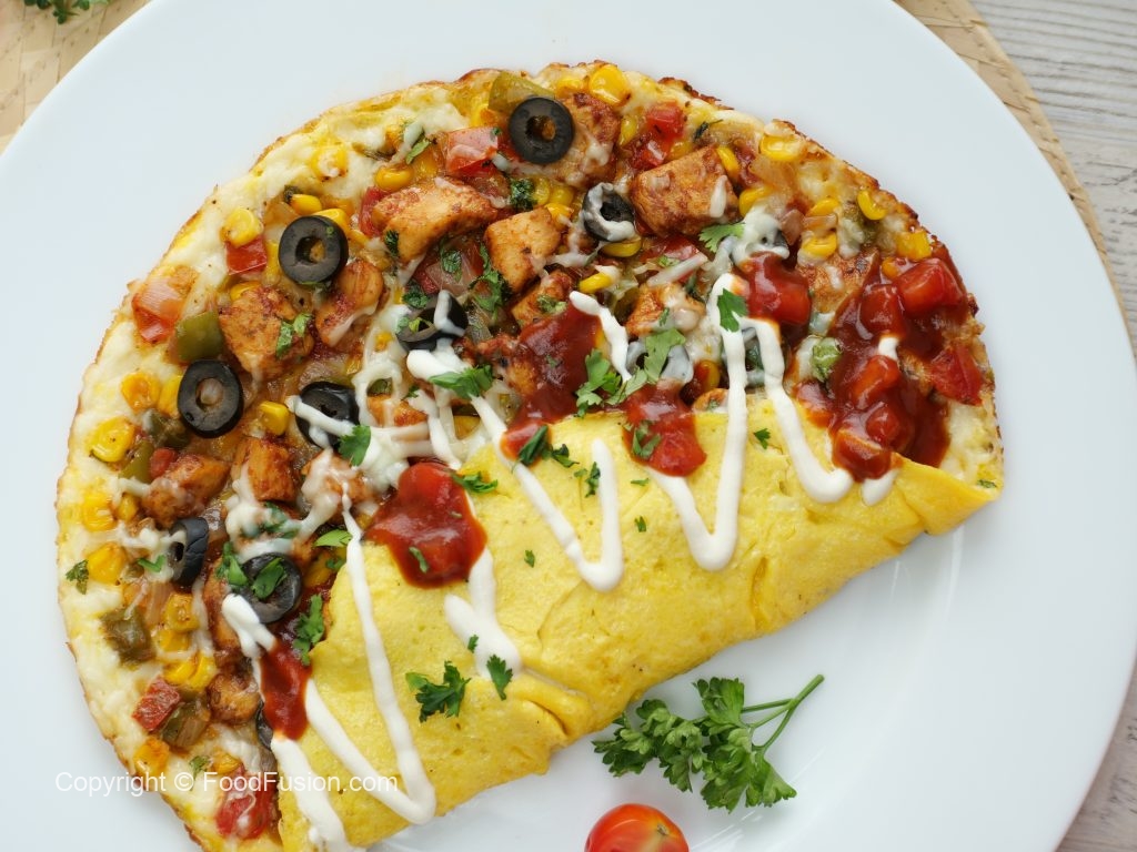 -On one side of the omelette,add grated cheddar cheese & mozzarella cheese,prepared vegetable, prepared taco chicken,black olives,fresh coriander,cheddar cheese,mozzarella cheese & flip the other side of egg,cover & cook on low flame until cheese melts (1-2 minutes).
