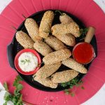 -Stuffed green chillies with prepared filling,coat in gram flour batter then coat with sesame seeds (makes 30-35) & let them rest for 15 minutes.
