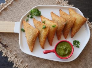 Pani laga lein,cheese slice aur tayyar chicken filling (1 tbs) rakh dein aur fold ker ka triangle shape bana lein aur edges ko press ker ka properly seal ker lein (makes 20-22).