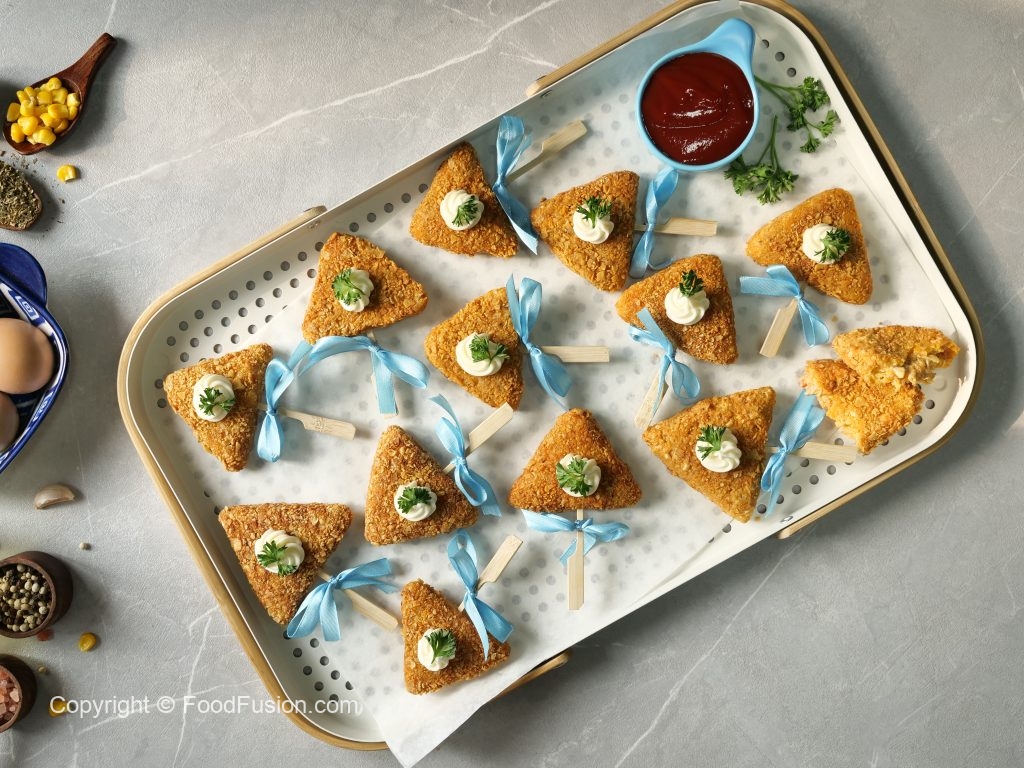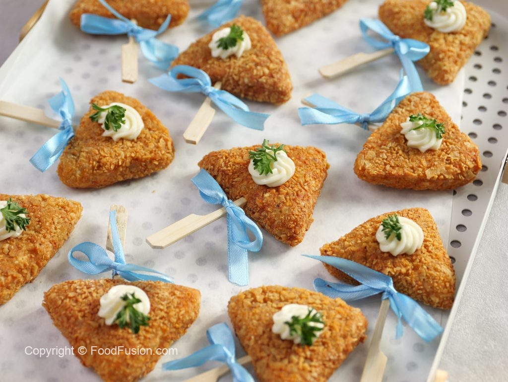 -Now coat with all-purpose flour then dip into whisked eggs & coat with nachos (makes 30-32).