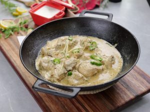 -Halki ancch per dahi,hari mirchein,kali mirch crushed,sabut dhania,safed mirch powder,zeera,chicken powder,coconut milk powder aur lemon juice dal ker ache tarhan mix karein aur tez ancch per oil alag ho janay tak paka lein (2-3 minutes).