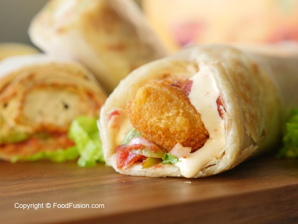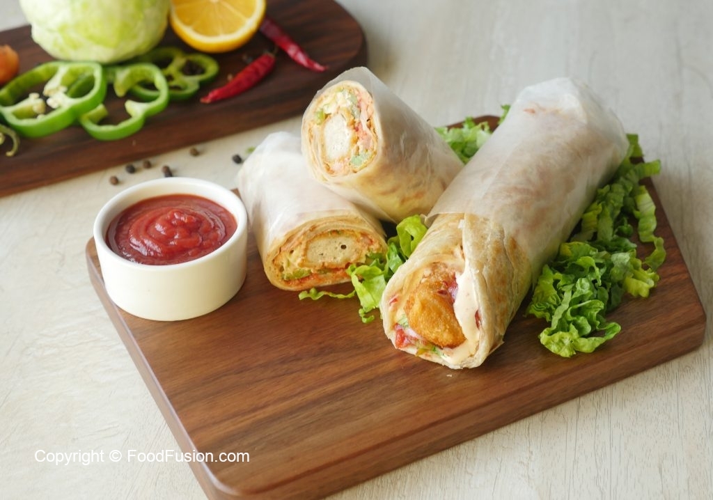 Paratha per tomato ketchup,stir fried vegetables,fried chicken nuggets aur tayyar cream & cheese sauce dal dein aur butter paper mein wrap ker ka serve karein!