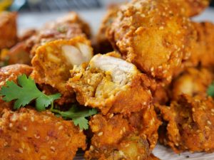 -In a bowl,add yogurt,ginger garlic paste,soy sauce,lemon juice,red chilli powder,coriander seeds,chaat masala,turmeric powder,red chilli crushed,cumin seeds,black pepper,orange food colour,carom seeds, pink salt & whisk well.