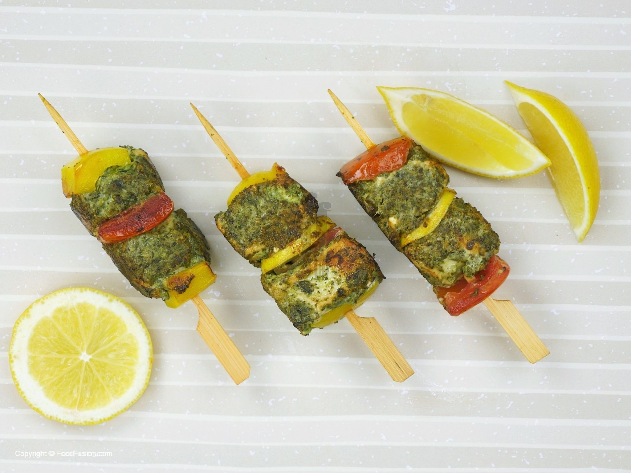 Ab marinated chicken,color bell pepper,tamatar,pyaz aur lemon slices ko skewers per assemble ker lein.