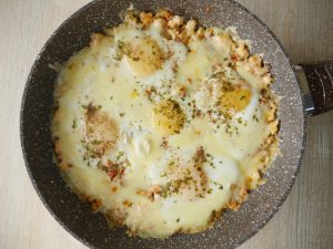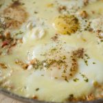 Spread evenly the cooked mixture,make holes and add eggs one by one and sprinkle salt,black pepper powder,dried parsley and cook on low flame for 2 minutes.