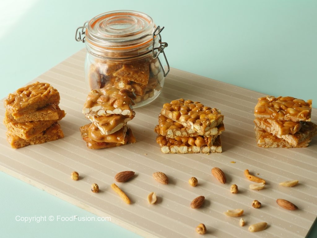 Gur syrup mein roasted moong phali ker ache tarhan mix karein.