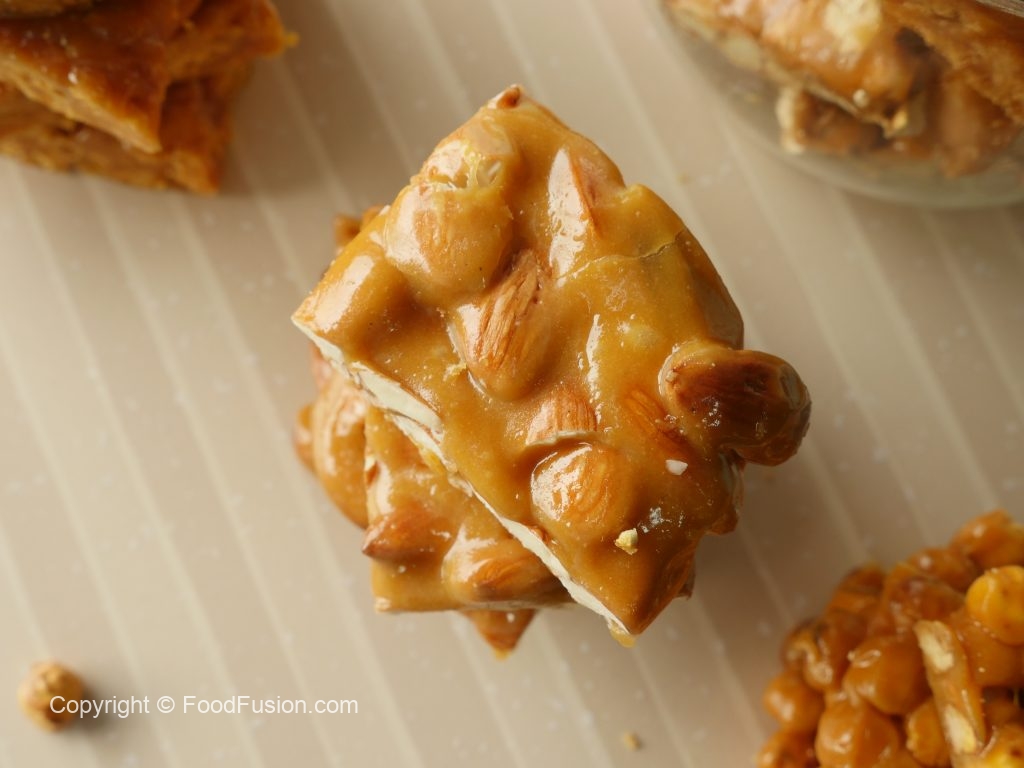Grease working surface or tray with oil then transfer roasted gram mixture to the grease surface,shape to a rectangular and roll the mixture with the help of rolling pin evenly.