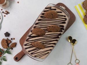 -Add a layer of soaked choco lava biscuits & chocolate custard cream.