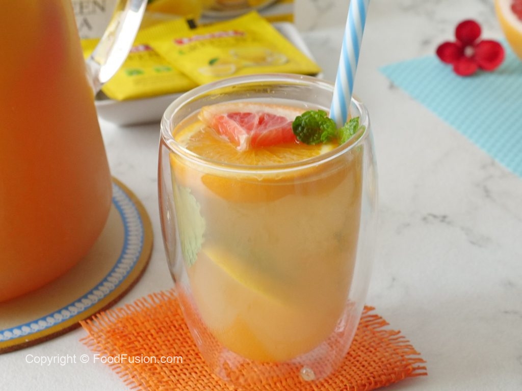 Jug mein ice cubes,lemon slices,orange slices,grape fruit slices,tayyar lemon green tea,grape fruit juice,orange juice,lemon juice aur podina dal ker stir ker lein & serve karein!