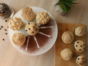 Put the cupcakes on a cooling rack to cool,when cooled,pipe the frosting over the cupcakes and decorate with coffee or chocolate chips.