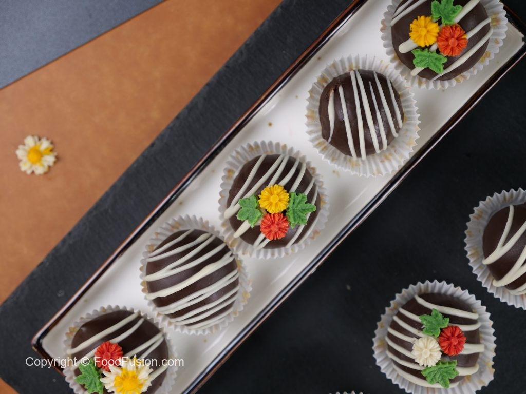 -White chocolate drizzle karein,chocolate flowers sa decorate ker lein aur set ho janay tak refrigerate ker lein (makes 12 truffles).