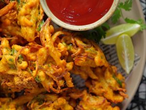 -In a wok,heat cooking oil & fry pakoray on medium flame until golden & crispy.