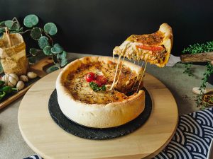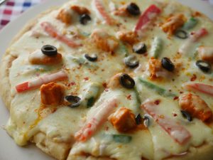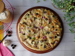 Cheddar cheese,mozzarella cheese,black olives,pickled jalapenos,dried oregano aur lal mirch crushed dal dein (makes 2 pizzas).