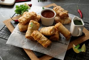 Add prepared creamy chicken filling and apply flour slurry then fold the sides and roll sheet to make samosa (makes 18-20).