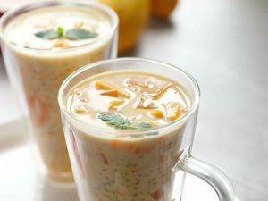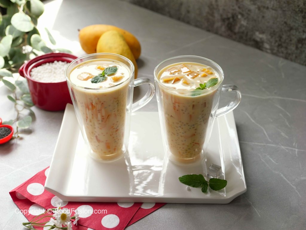 -In a bowl,add mango puree,boiled tapioca sago,mango cubes,soaked basil seeds,mango jelly,prepared creamy milk,ice cubes,mix well & serve!