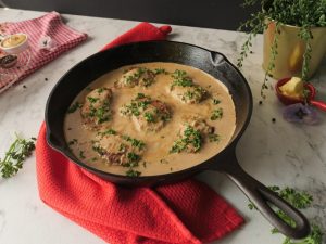 -In a jug add cream,chicken stock,dijon mustard,salt,black pepper crushed,cayenne pepper,dried thyme,whisk well & set aside.