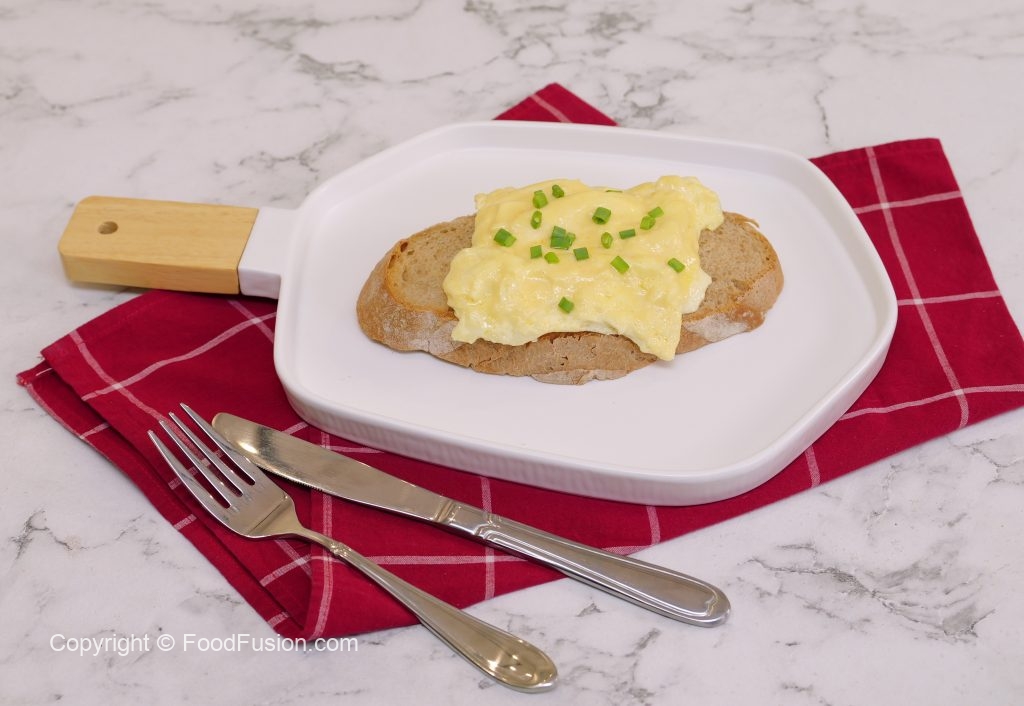 -Scrambled egg ko sour bread ka supper rakh dein & hara pyaz leaves dal ker serve karein!