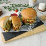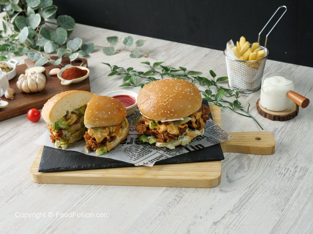 -Burger bun per mayonnaise laga lein,iceberg,crispy fried chicken,tayyar spicy mayo sauce,tayyar cheese patty,spicy mayo sauce,iceberg & pickled jalapenos dal dein.