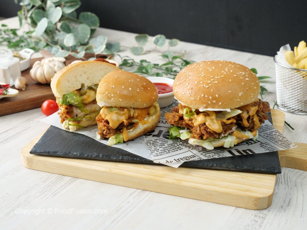 -On burger bun,add & spread mayonnaise,iceberg,crispy fried chicken,prepared spicy mayo sauce ,prepared cheese patty,spicy mayo sauce,iceberg & pickled jalapenos.