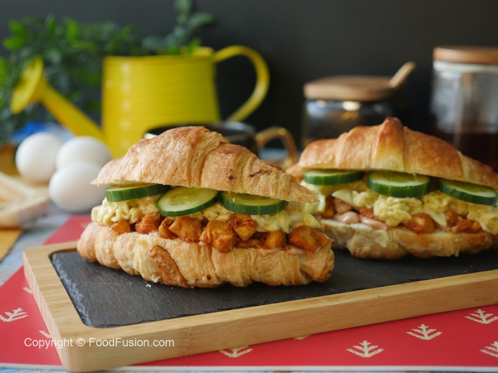 Add prepared mayo sauce,chicken tikka cubes,cheese slices,prepared scrambled eggs,cucumber slices & croissant on top (makes 3-4).