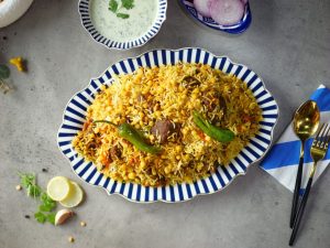 -In a bowl,add yogurt,fried onion,coriander powder,red chilli powder,cumin powder,turmeric powder, garam masala powder,pink salt,mace powder,nutmeg powder,dried plums,tamarind,tomato,mint leaves,fresh coriander & mix well.