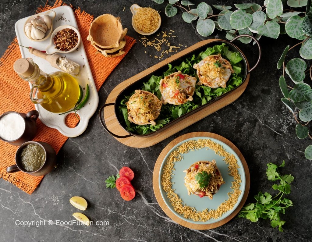On dough pocket,add bhondi,chaat masala,potato,tomato,onion,spicy hari chutney,imli ki meethi chutney,prepared yogurt,chaat masala,red chilli powder,sev nimco & serve!