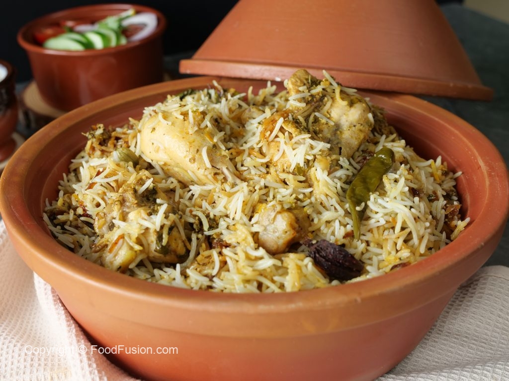 -In a cooking pot,spread thin layer of rice,marinated chicken,remaining boiled rice,garam masala powder,mint leaves, fresh coriander,fried onion & clarified butter.
