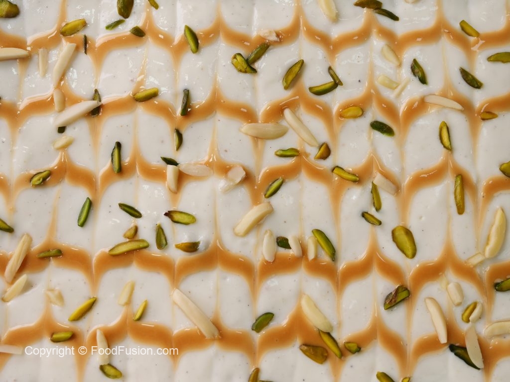-Garnish with prepared caramel sauce,sprinkle pistachios & almonds.