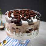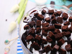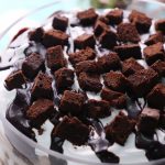 -Add prepared hot fudge sauce,brownie pieces & brush prepared coffee mixture on brownie pieces.