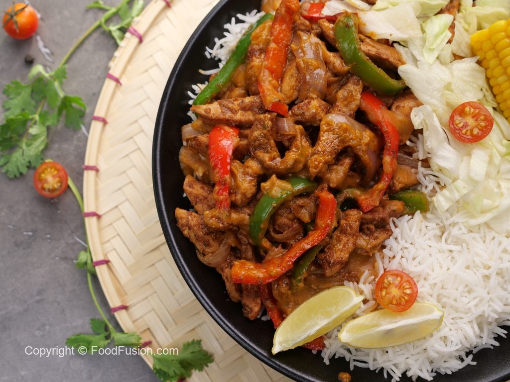 -Serving bowl mein boiled rice,tayyar fajita chicken,tayyar tomato sauce,iceberg,corn cob,lemon wedges & cherry tomato ka saath serve karein!